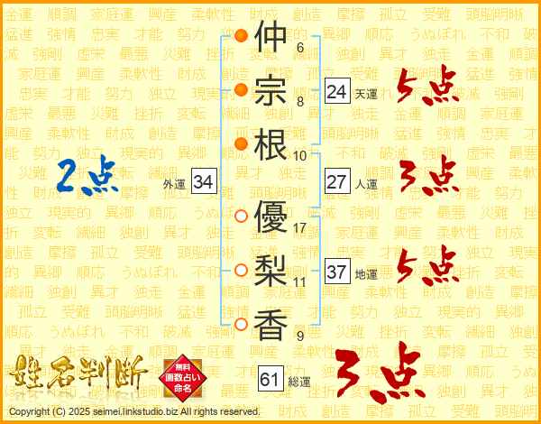 仲(6画)宗(8画)根(10画) 優(17画)梨(11画)香(9画)