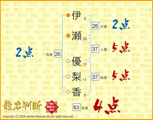伊(6画)瀬(20画) 優(17画)梨(11画)香(9画)