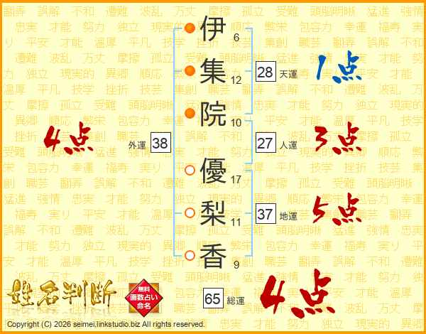 伊(6画)集(12画)院(10画) 優(17画)梨(11画)香(9画)