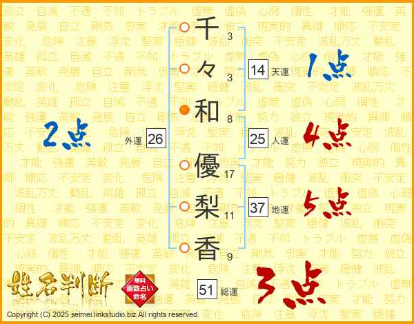 千(3画)々(3画)和(8画) 優(17画)梨(11画)香(9画)
