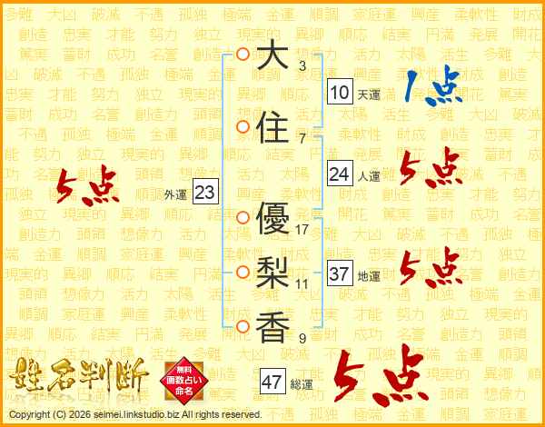 大(3画)住(7画) 優(17画)梨(11画)香(9画)