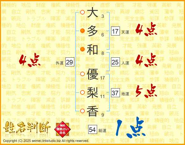 大(3画)多(6画)和(8画) 優(17画)梨(11画)香(9画)