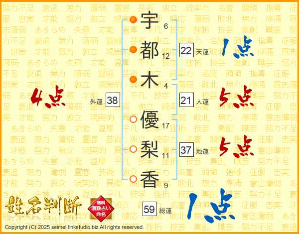 宇(6画)都(12画)木(4画) 優(17画)梨(11画)香(9画)