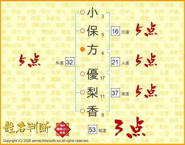 小保方優梨香さんの外運は32画の5点!