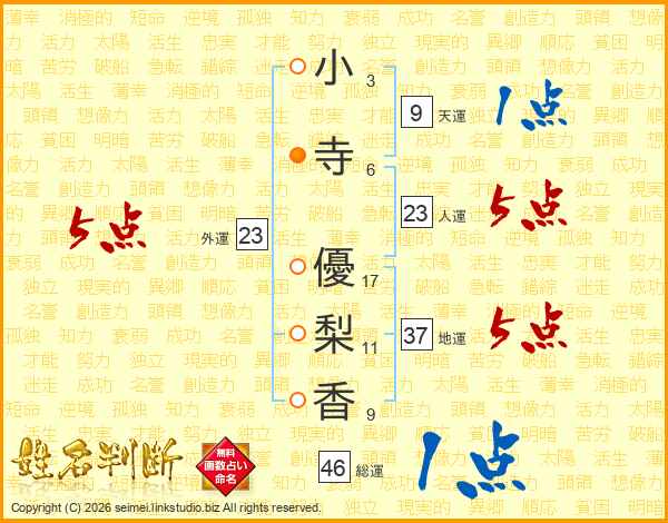 小(3画)寺(6画) 優(17画)梨(11画)香(9画)
