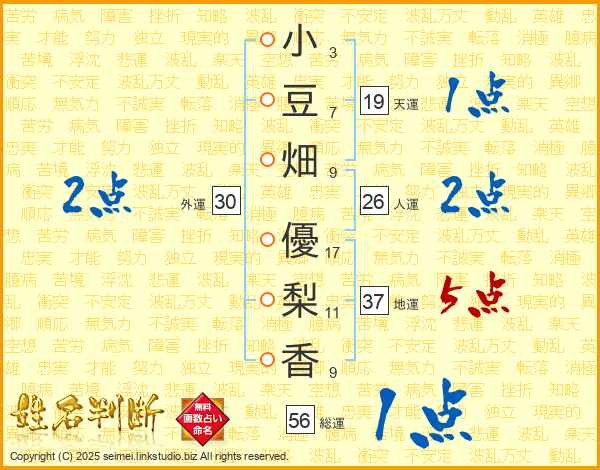 小(3画)豆(7画)畑(9画) 優(17画)梨(11画)香(9画)