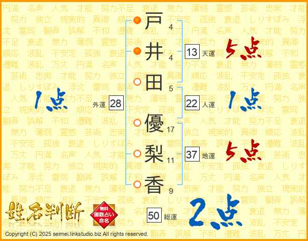 戸(4画)井(4画)田(5画) 優(17画)梨(11画)香(9画)