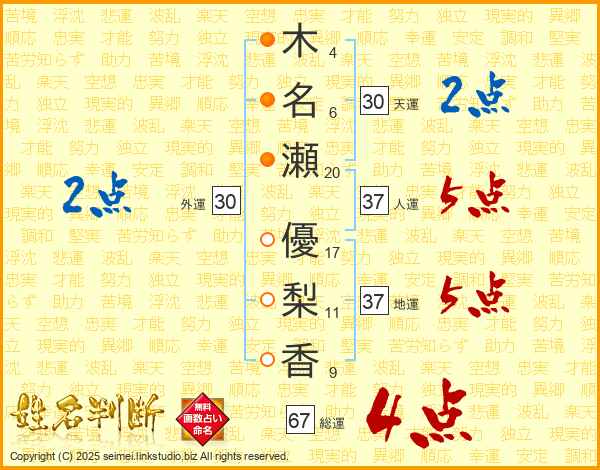 木(4画)名(6画)瀬(20画) 優(17画)梨(11画)香(9画)