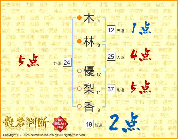 木(4画)林(8画) 優(17画)梨(11画)香(9画)