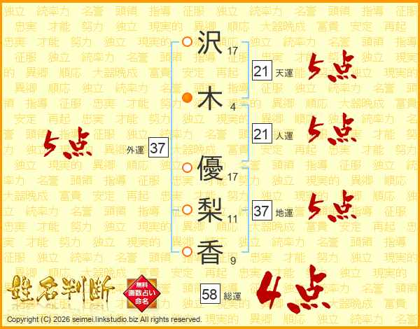 沢(17画)木(4画) 優(17画)梨(11画)香(9画)