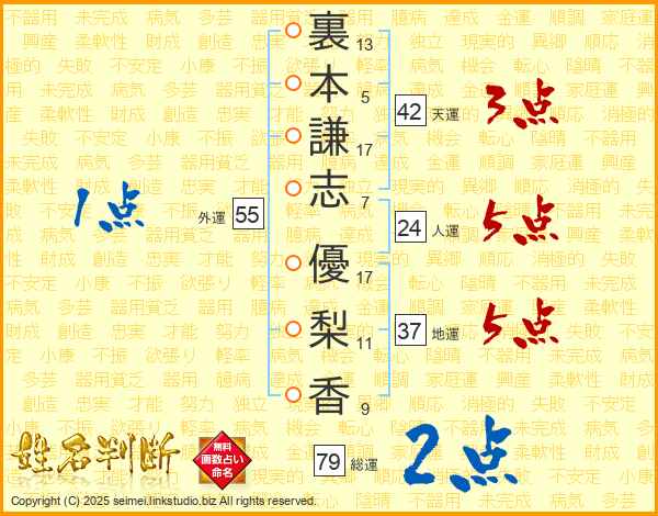 裏(13画)本(5画)謙(17画)志(7画) 優(17画)梨(11画)香(9画)