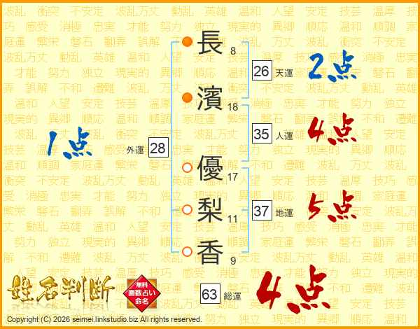 長(8画)濱(18画) 優(17画)梨(11画)香(9画)