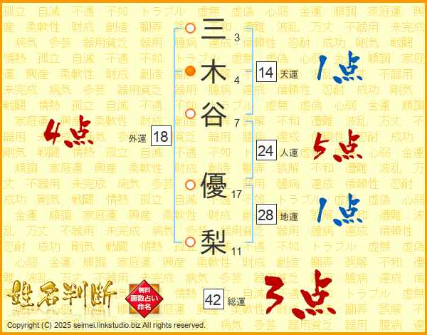 三(3画)木(4画)谷(7画) 優(17画)梨(11画)