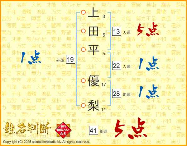 上(3画)田(5画)平(5画) 優(17画)梨(11画)