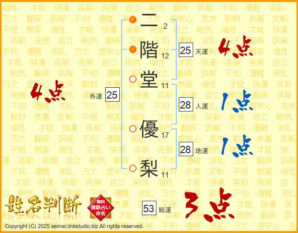 二(2画)階(12画)堂(11画) 優(17画)梨(11画)