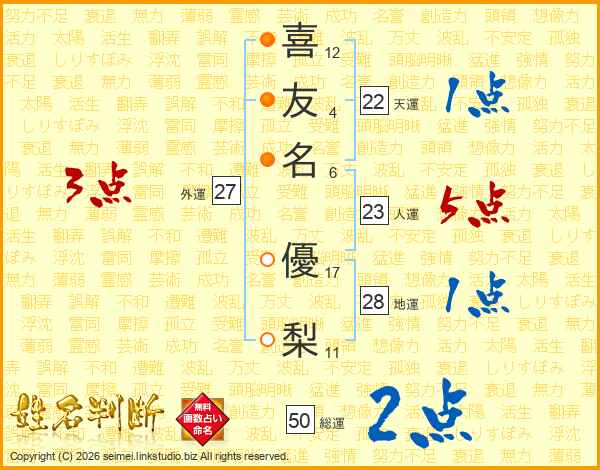 喜(12画)友(4画)名(6画) 優(17画)梨(11画)