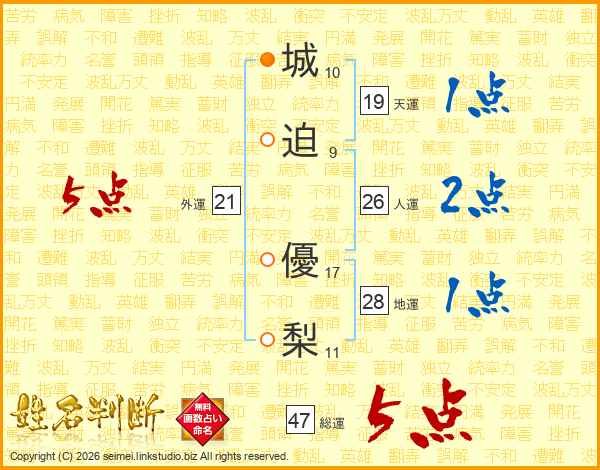 生活面を象徴する運勢です。外部から受ける影響力を表し、結婚運、家庭運や職場、環境への順応性を表します。総運から人運を引いた画数。姓や名が1文字の場合を除く。