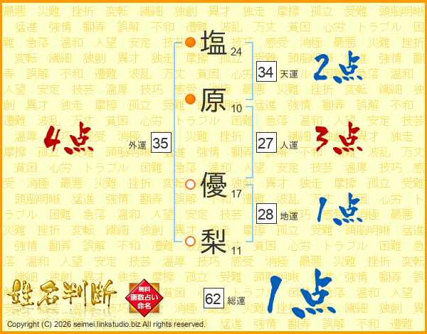 塩(24画)原(10画) 優(17画)梨(11画)