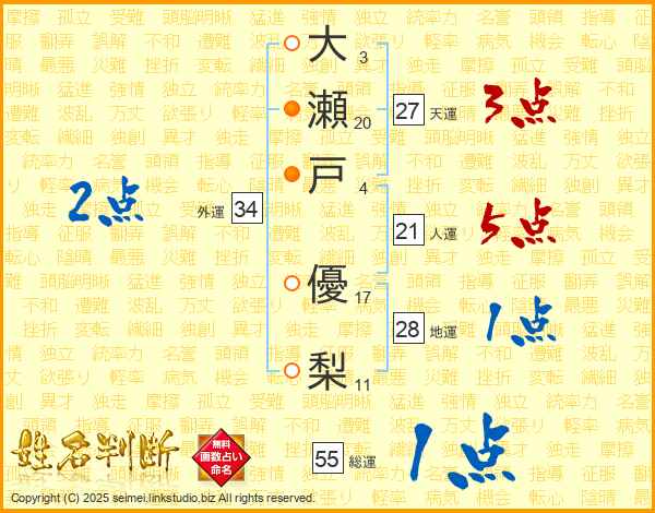 大(3画)瀬(20画)戸(4画) 優(17画)梨(11画)