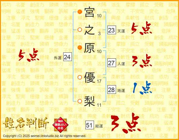 宮(10画)之(3画)原(10画) 優(17画)梨(11画)