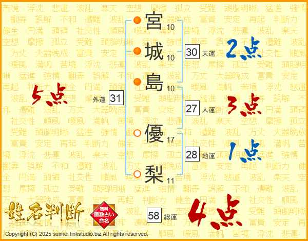 宮(10画)城(10画)島(10画) 優(17画)梨(11画)