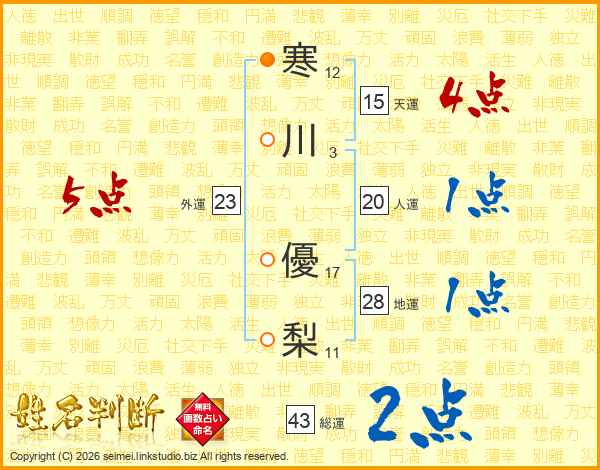 寒川優梨さんの総運は43画の2点!
