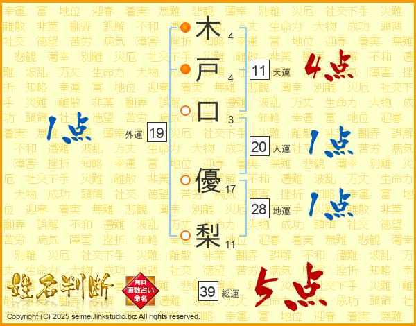 木(4画)戸(4画)口(3画) 優(17画)梨(11画)
