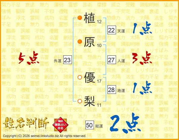 植(12画)原(10画) 優(17画)梨(11画)