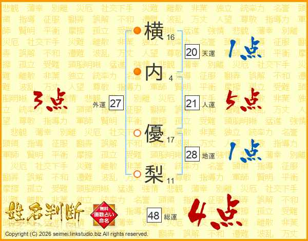 生活面を象徴する運勢です。外部から受ける影響力を表し、結婚運、家庭運や職場、環境への順応性を表します。総運から人運を引いた画数。姓や名が1文字の場合を除く。