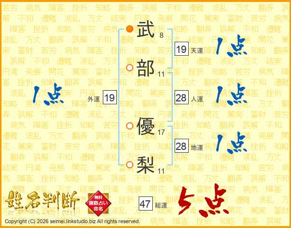 生活面を象徴する運勢です。外部から受ける影響力を表し、結婚運、家庭運や職場、環境への順応性を表します。総運から人運を引いた画数。姓や名が1文字の場合を除く。
