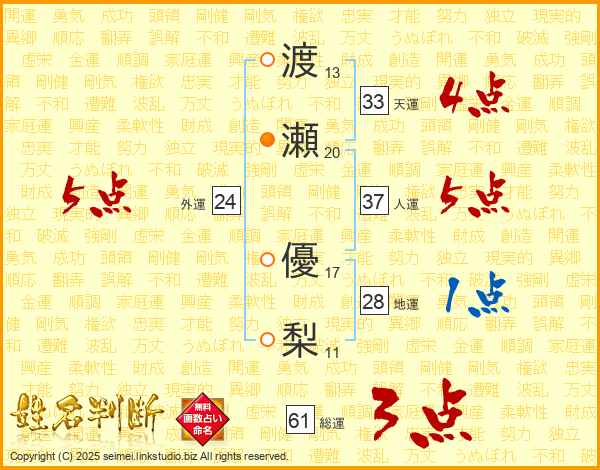 渡(13画)瀬(20画) 優(17画)梨(11画)