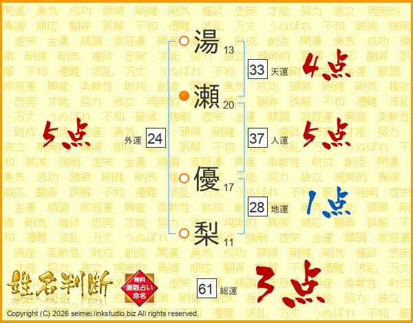 湯(13画)瀬(20画) 優(17画)梨(11画)