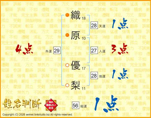 織(18画)原(10画) 優(17画)梨(11画)
