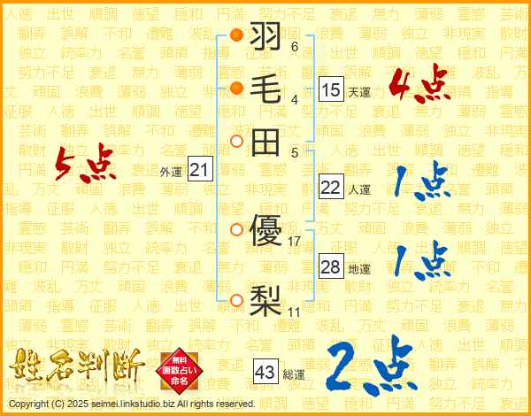 羽(6画)毛(4画)田(5画) 優(17画)梨(11画)