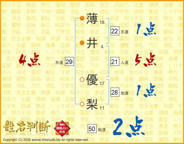 生活面を象徴する運勢です。外部から受ける影響力を表し、結婚運、家庭運や職場、環境への順応性を表します。総運から人運を引いた画数。姓や名が1文字の場合を除く。