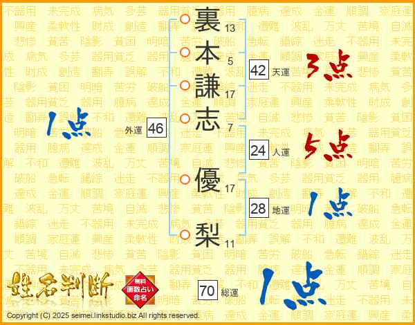 裏(13画)本(5画)謙(17画)志(7画) 優(17画)梨(11画)