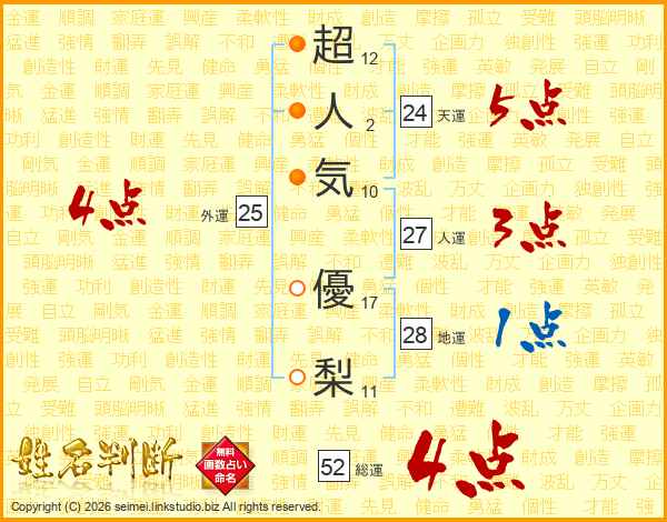 超人気優梨さんの総運は52画の4点!