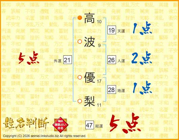 生活面を象徴する運勢です。外部から受ける影響力を表し、結婚運、家庭運や職場、環境への順応性を表します。総運から人運を引いた画数。姓や名が1文字の場合を除く。