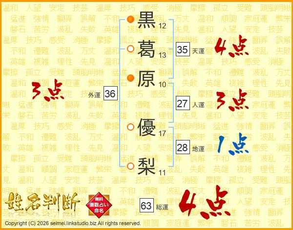黒(12画)葛(13画)原(10画) 優(17画)梨(11画)