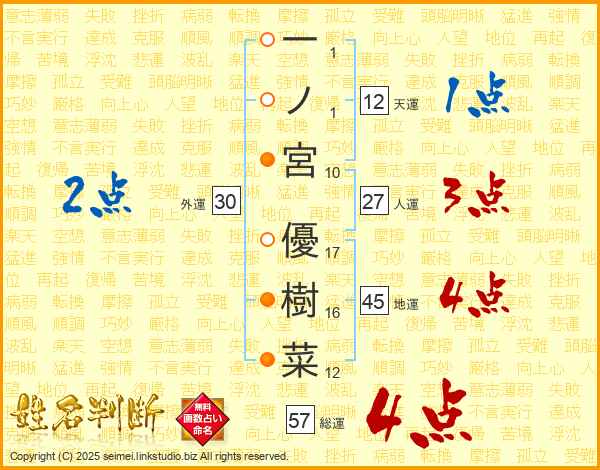 一ノ宮優樹菜さんの総運は57画の4点!