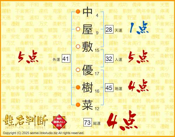 中(4画)屋(9画)敷(15画) 優(17画)樹(16画)菜(12画)