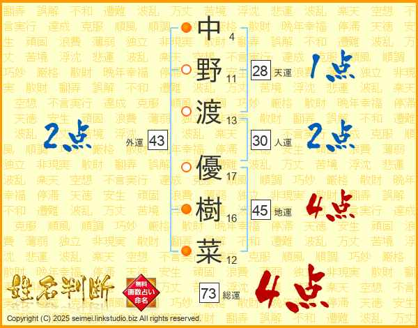 中野渡優樹菜さんの総運は73画の4点!