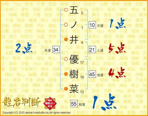 五(5画)ノ(1画)井(4画) 優(17画)樹(16画)菜(12画)