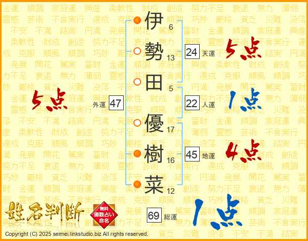 伊(6画)勢(13画)田(5画) 優(17画)樹(16画)菜(12画)