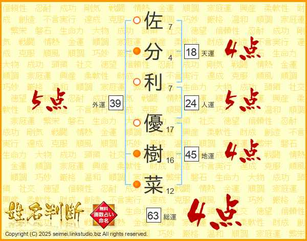 佐(7画)分(4画)利(7画) 優(17画)樹(16画)菜(12画)