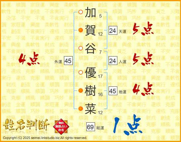 加(5画)賀(12画)谷(7画) 優(17画)樹(16画)菜(12画)