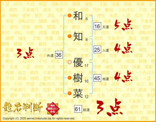 和(8画)知(8画) 優(17画)樹(16画)菜(12画)