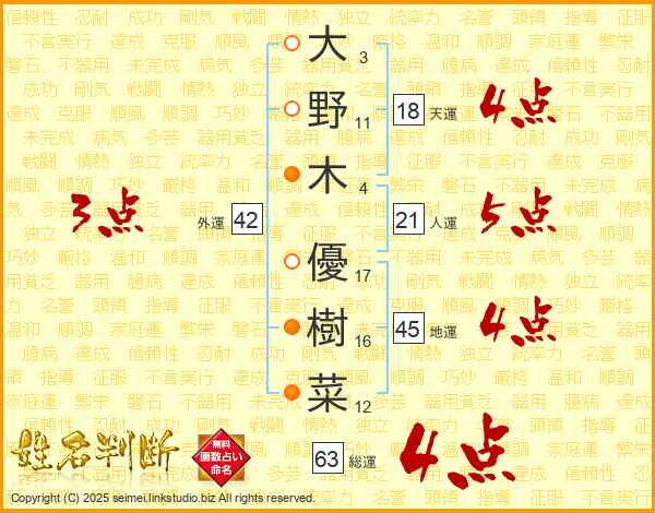大(3画)野(11画)木(4画) 優(17画)樹(16画)菜(12画)