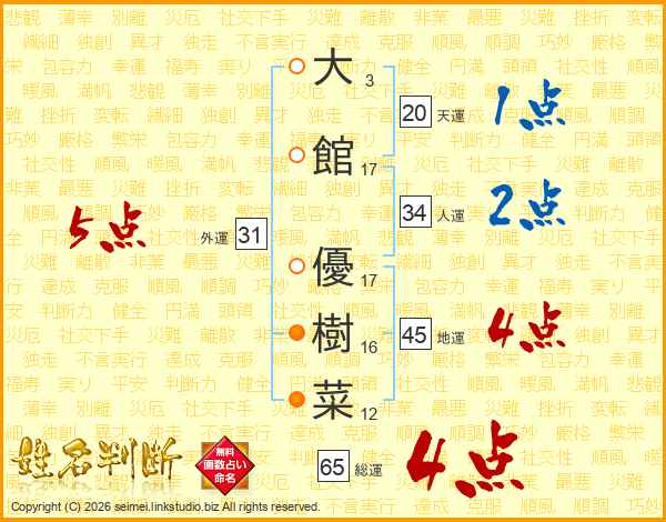 大(3画)館(17画) 優(17画)樹(16画)菜(12画)