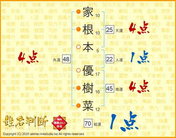 家(10画)根(10画)本(5画) 優(17画)樹(16画)菜(12画)